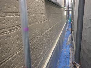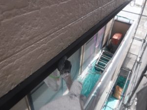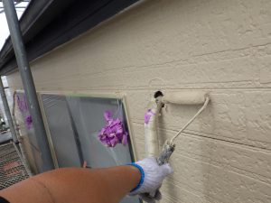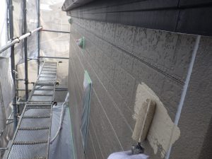 外壁材を保護し、上に塗る塗料の密着を良くするため、下塗り剤を塗ります。