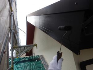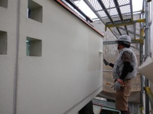外壁材を保護し、上に塗る塗料の密着を良くするため、下塗り剤を塗ります。