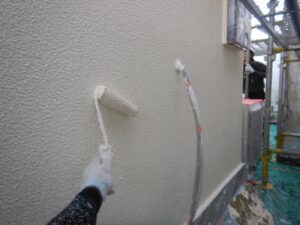 塗膜のひび割れや、壁のひび割れなどを目埋めするために中塗り剤を塗ります。