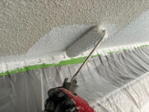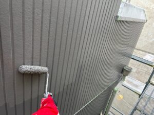外壁材を保護し、上に塗る塗料の密着を良くするため、下塗り剤を塗ります。