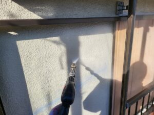 外壁材を保護し、上に塗る塗料の密着を良くするため、下塗り剤を塗ります。