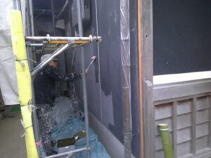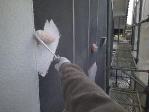 外壁材を保護し、上に塗る塗料の密着を良くするため、下塗り剤を塗ります。