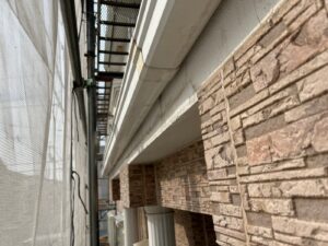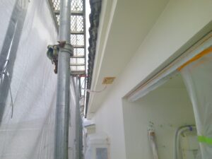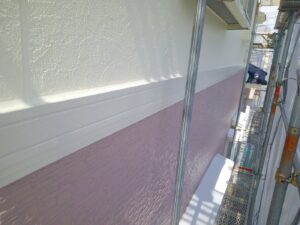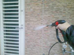 外壁材を保護し、上に塗る塗料の密着を良くするため、下塗り剤を塗ります。