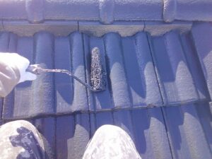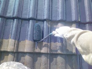 屋根材を保護し、上に塗る塗料の密着を良くするため、下塗り剤を塗ります。