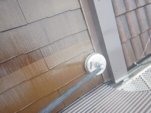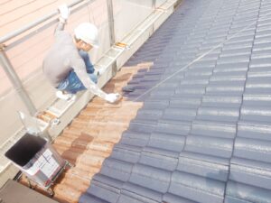 屋根材を保護し、上に塗る塗料の密着を良くするため、下塗り剤を塗ります。
