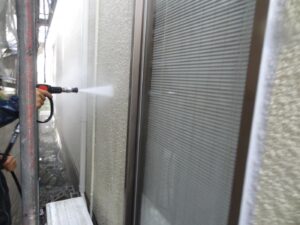 外壁材を保護し、上に塗る塗料の密着を良くするため、下塗り剤を塗ります。