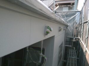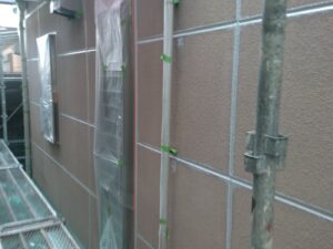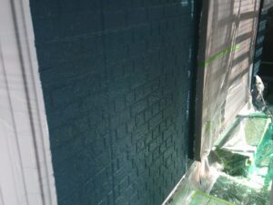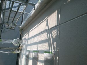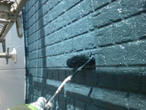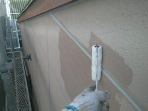 外壁材を保護し、上に塗る塗料の密着を良くするため、下塗り剤を塗ります。