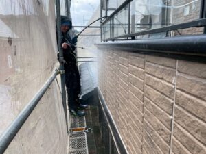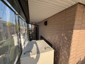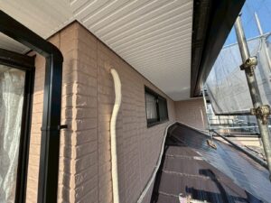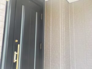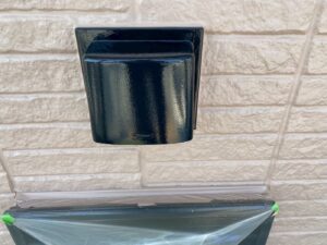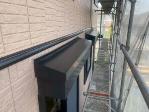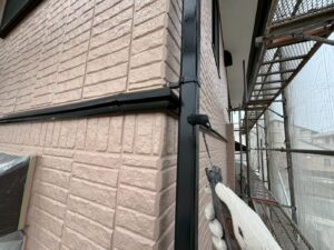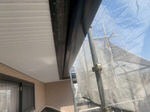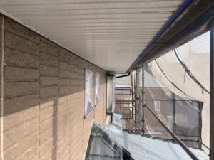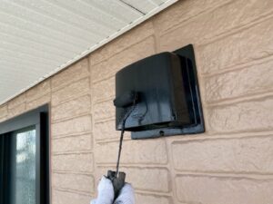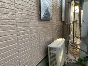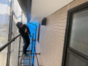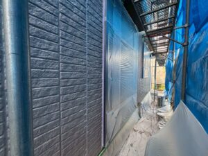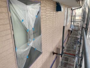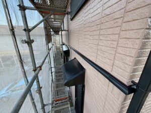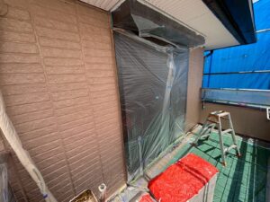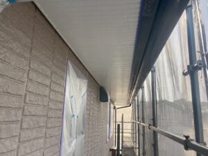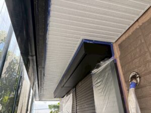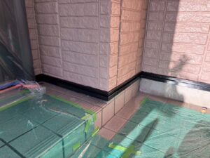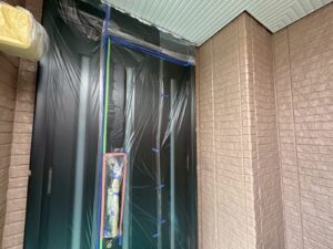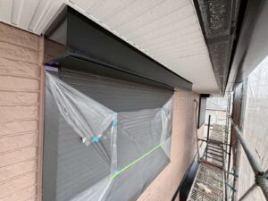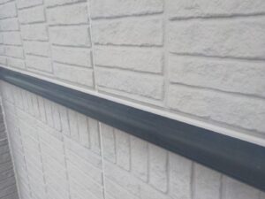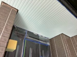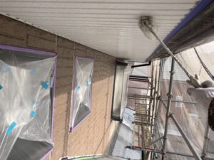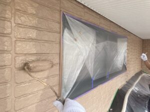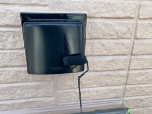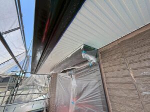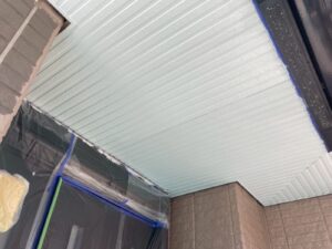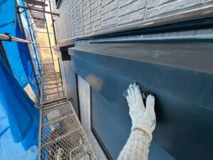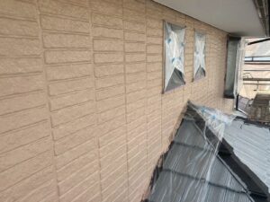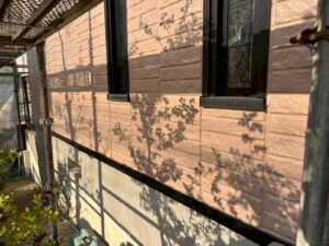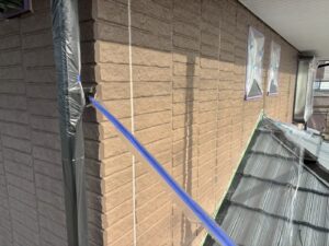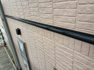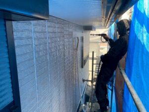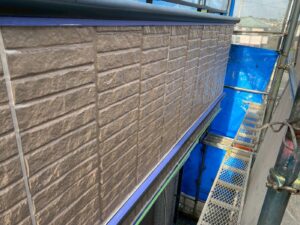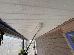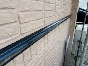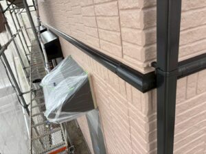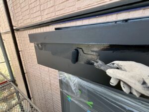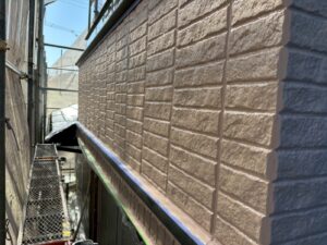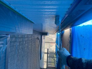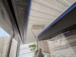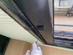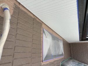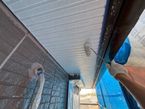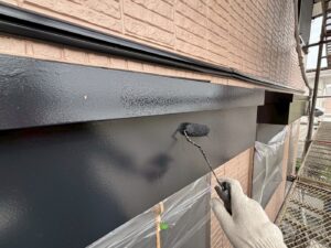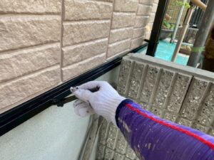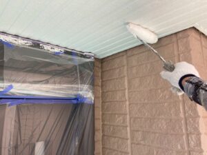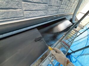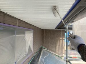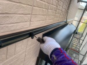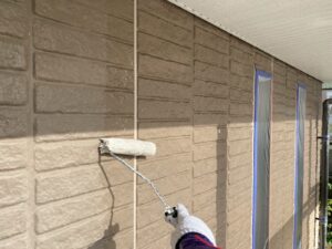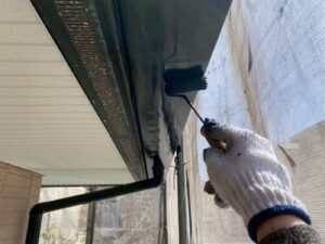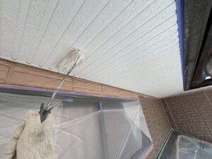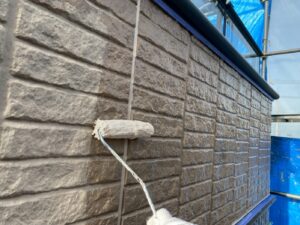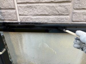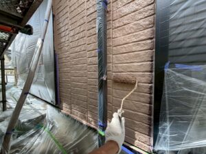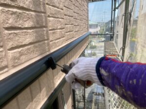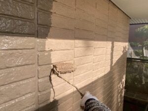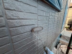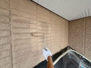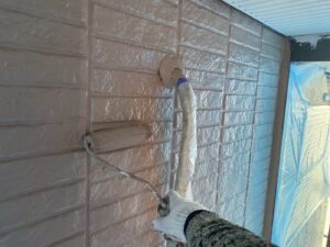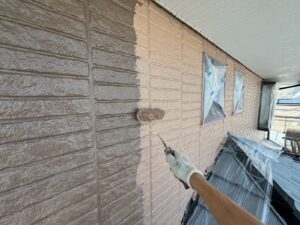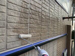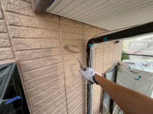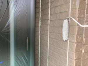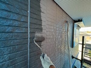 外壁材を保護し、上に塗る塗料の密着を良くするため、下塗り剤を塗ります。