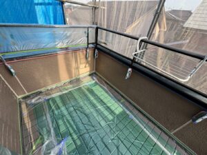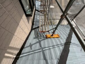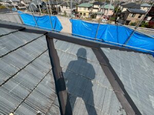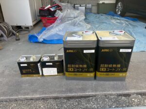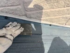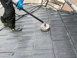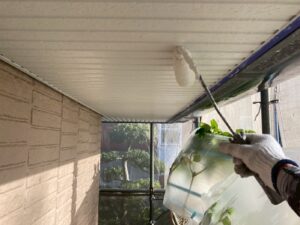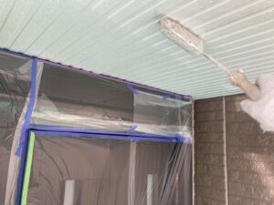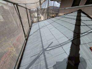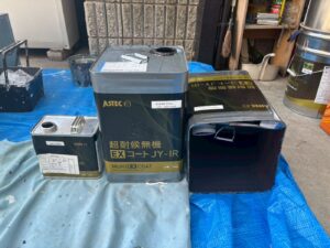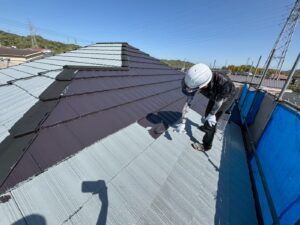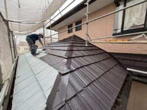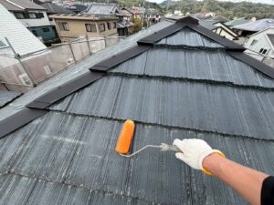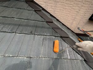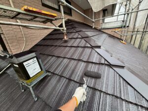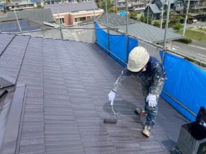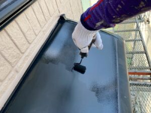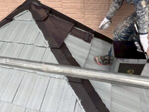 屋根材を保護し、上に塗る塗料の密着を良くするため、下塗り剤を塗ります。