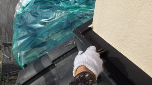 外壁材を保護し、上に塗る塗料の密着を良くするため、下塗り剤を塗ります。