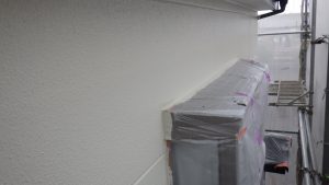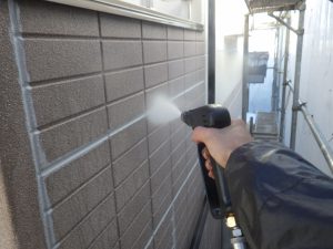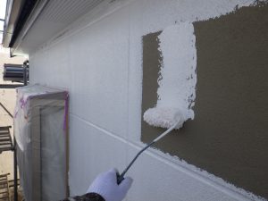 外壁材を保護し、上に塗る塗料の密着を良くするため、下塗り剤を塗ります。