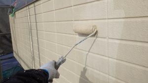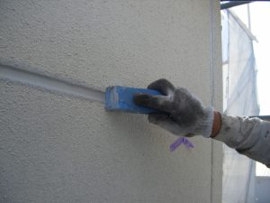 塗膜のひび割れや、壁のひび割れなどを目埋めするために中塗り剤を塗ります。