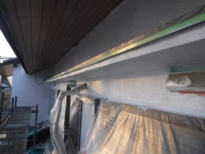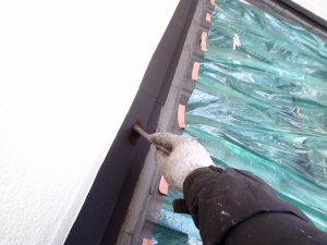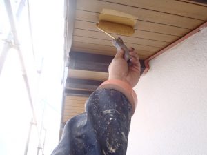 外壁材を保護し、上に塗る塗料の密着を良くするため、下塗り剤を塗ります。