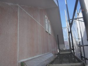 外壁材を保護し、上に塗る塗料の密着を良くするため、下塗り剤を塗ります。