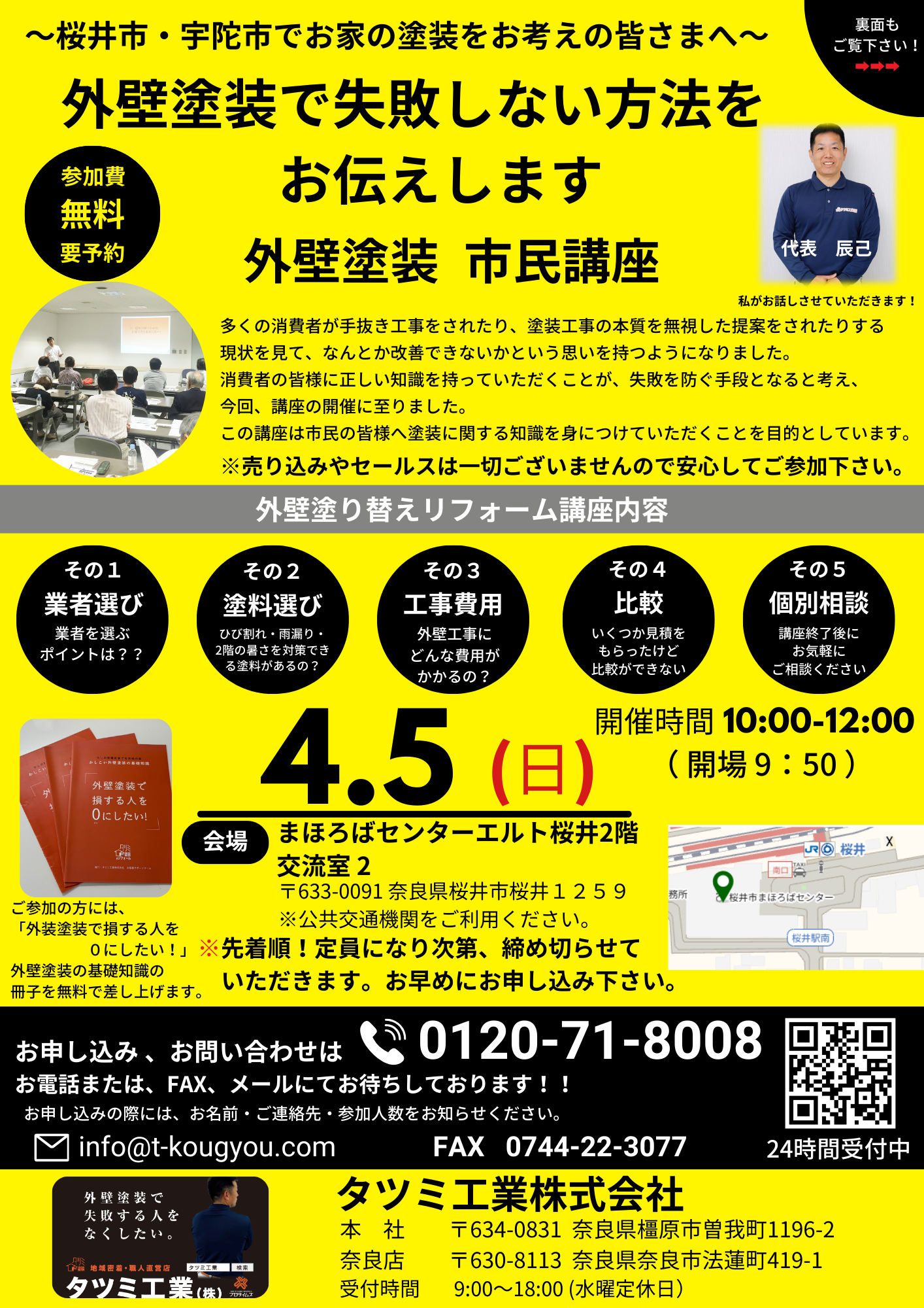 詳細はこちら※「勉強会」はタツミ工業が独自に開催している講座です。自治体が主催するものではありません